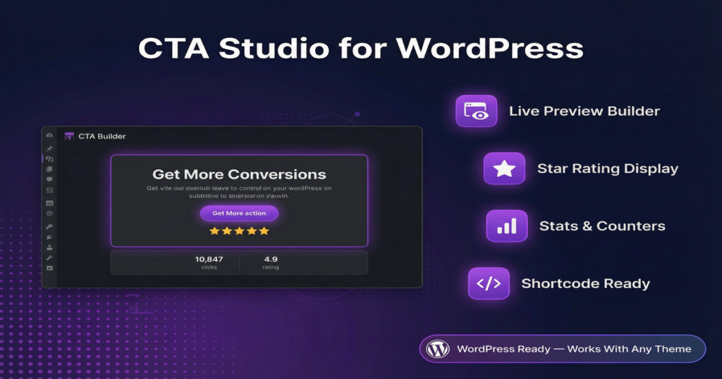 CTA Studio is a WordPress plugin for building fully customised call-to-action boxes with a live preview designer. Create headlines, descriptions, styled buttons, and — with Pro — star ratings and stats counters, then embed them anywhere using a shortcode.